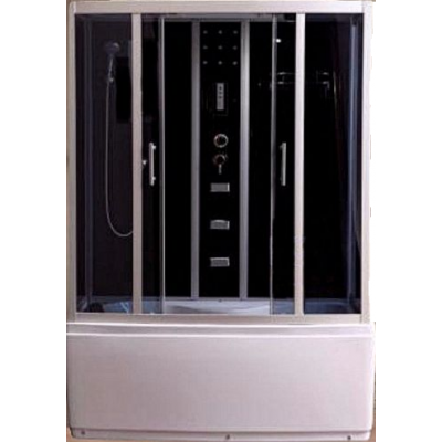 Усиленный акриловый душевой поддон с каркасом и панелью плоская крыша; черные закаленные задние стекла; тонированные передние стекла; поясничный гидромассаж; ручной душ; тропический душ; пульт; радио, вентилятор, подсветка; декоративная подсветка; полочка; сиденье.