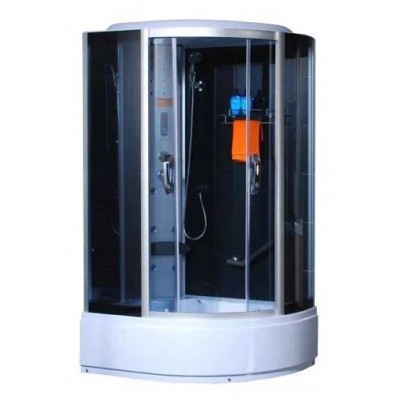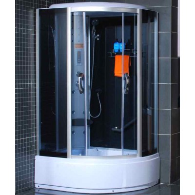 Акриловый поддон с сиденьем. Высота поддона (40 см). Слив располагается по центру левой стороны поддона. Металлический каркас жесткости поддона. Ножки поддона регулируемые, панель съемная. Сифон. Задняя стенка из стекла: чёрная. Передние стекла: тонированные. Стекло закаленное 5 мм. Профиль алюминиевый, матовый хром. Боковая и верхняя независимые подсветки. Вентиляция. Радио. Телефон (на входящие вызовы). Массажер ног. Душевая многофункциональная лейка. Верхний душ (тропический ливень) диаметр 23 см. Металлическая панель с регулируемыми гидромассажными форсунками (6 шт.)  Спинка на центральной панели.Полочка для ванных принадлежностей. Зеркало.