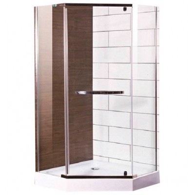 Акриловый поддон. Форма поддоны пятигранник. Высота поддона 15 см. Слив располагается по центру в углу поддона. Панель не съемная. Металлический каркас жесткости поддона. Ножки поддона регулируемые. Сифон. Стекло закаленное 6 мм. Варианты стекла: прозрачное/тонированное. Пристенные профиля алюминиевые двойные, блестящий хром. Ручка из латуни, хромированная.