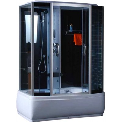 Акриловый поддон с сиденьем. Высота поддона (40 см). Слив располагается справа от сиденья, ближе к задней стенке. Металлический каркас жесткости поддона. Ножки поддона регулируемые, панель съемная. Сифон с переливом. Кран для налива воды в поддон. Подголовник. Задняя стенка из стекла: чёрная. Передние стекла: тонированные. Стекло закаленное 5 мм. Профиль алюминиевый, матовый хром. Боковая и верхняя независимые подсветки. Вентиляция. Радио. Телефон (на входящие вызовы). Массажер ног. Душевая многофункциональная лейка. Верхний душ (тропический ливень) диаметр 23 см. Металлическая панель с регулируемыми гидромассажными форсунками (6 шт.) Спинка на центральной панели. Полочка для ванных принадлежностей. Зеркало.