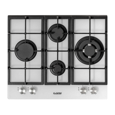 Белое закаленное стекло - эстетично и легко чистится. Поворотные переключатели для эргономичного контроля. Трехконтурная конфорка WOK: система трех контуров пламени для приготовления пищи на высокой мощности до 3,8 кВт. Для большего удобства решетки можно мыть в посудомоечной машине. Составная чугунная решетка: для высокой прочности и устойчивости посуды. Для безопасности использования предусмотрена функция газ-контроля и электроподжиг.