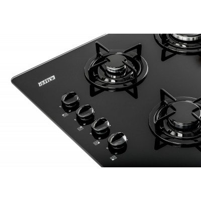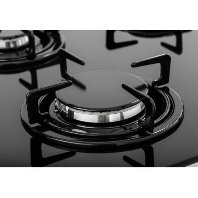 Черное закаленное стекло - эстетично и легко чистится. Поворотные переключатели: для эргономичного контроля. Для большего удобства решетки можно мыть в посудомоечной машинке. Функции газ контроля и электроподжиг - для безопасности использования. Индивидуальные решетки из эмалированной стали для всех конфорок - высокая прочность и простота в обращении.